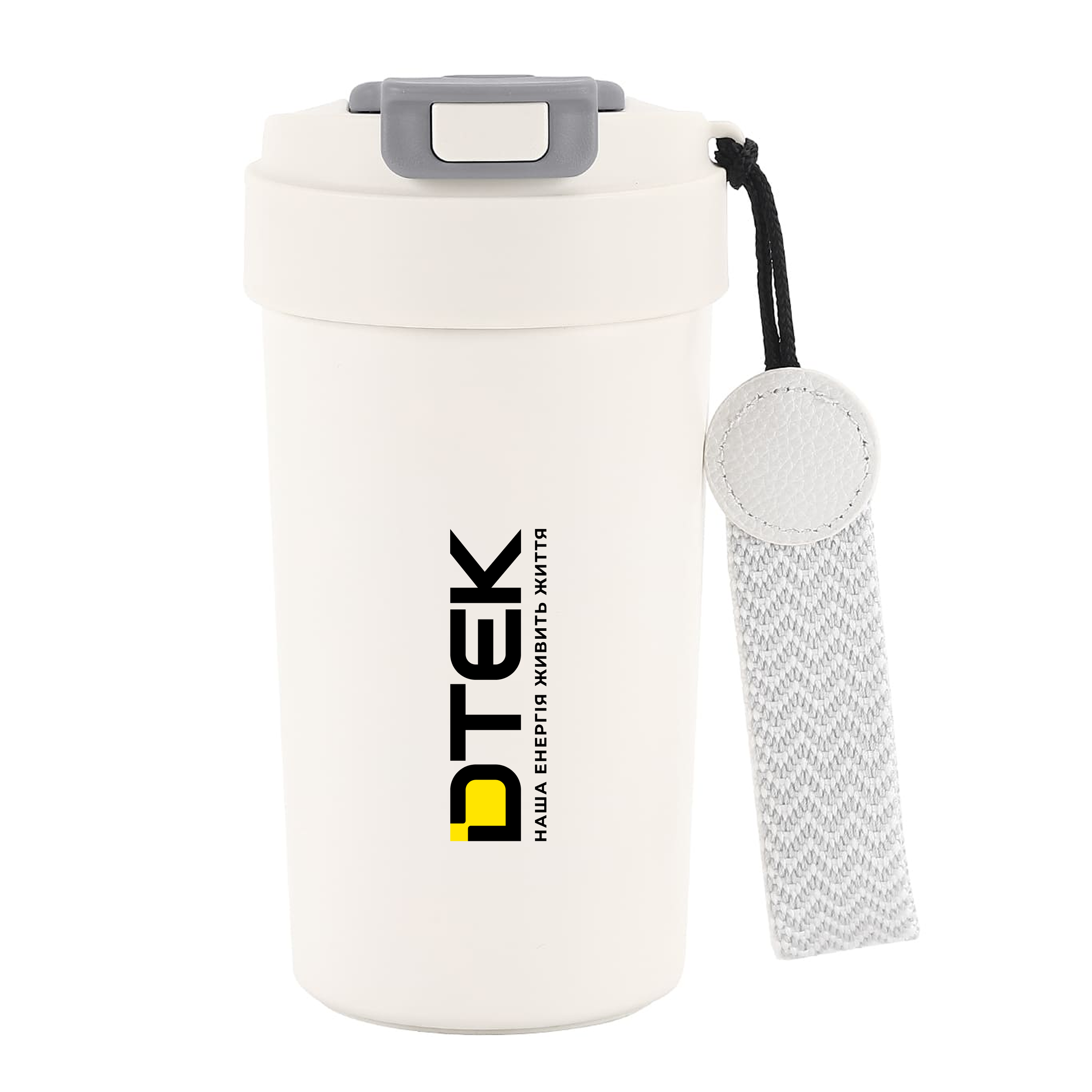 Термокружка з подвійною стінкою з нержавіючої сталі та вакуумною кришкою з кнопкою блокування.