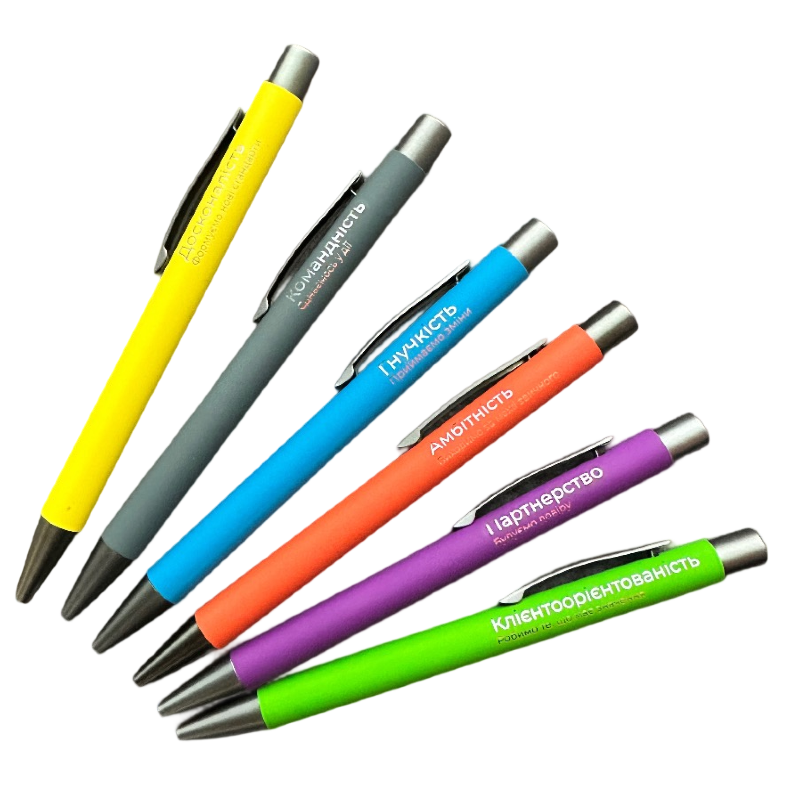 Колекція “Ручки з цінностями” – це 6 унікальних кольорів і 6 гравіювань: Амбітність, Досконалість, Командність, Гнучкість, Партнерство, Клієнтоорієнтованість.