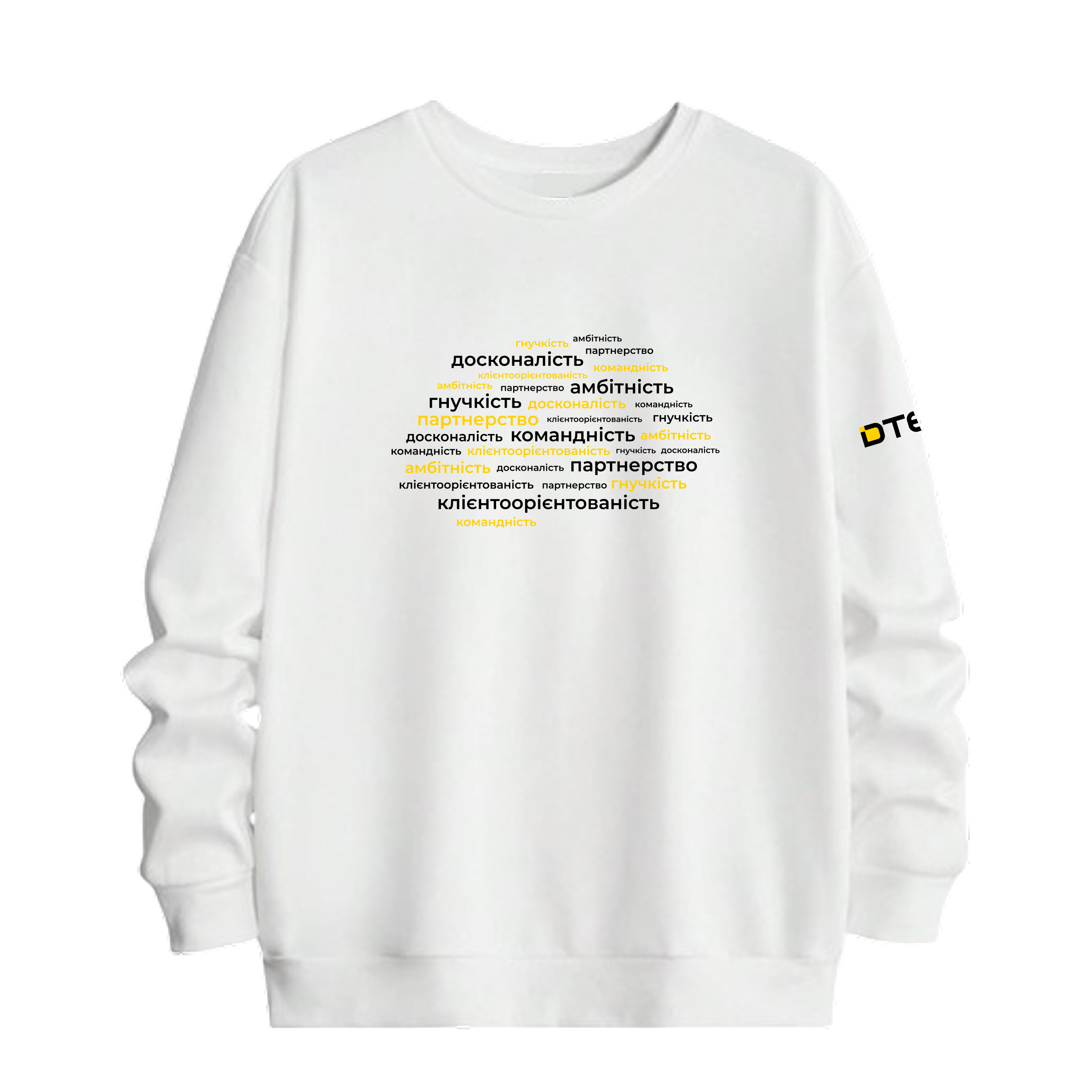 Один світшот — одна “хмара” цінностей ДТЕК: Амбітність, Досконалість, Командність, Гнучкість, Партнерство, Клієнтоорієнтованість. Лаконічний дизайн, який легко поєднується з повсякденним стилем і нагадує про те, що нас об’єднує — щодня.
